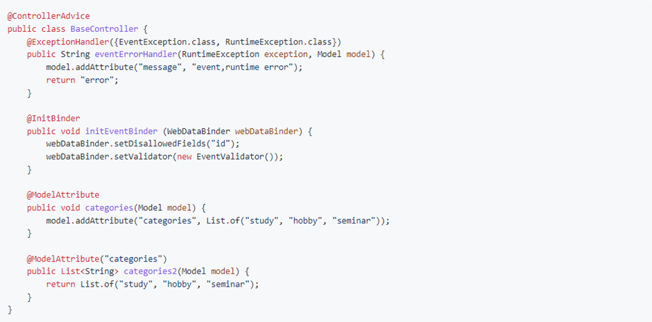 : @ControllerAdvice는 @Controller 어노테이션이 있는 모든 곳에서의 예외를 잡을 수 있도록 해준다. @ControllerAdvice 안에 있는 @ExceptionHandler는 모든 컨트롤러에서 발생하는 예외상황을 잡을 수 있다. @ControllerAdvice 의 속성 설정을 통하여 원하는 컨트롤러나 패키지만 선택할 수 있다. 따로 지정을 하지 않으면 모든 패키지에 있는 컨트롤러를 담당하게 된다.