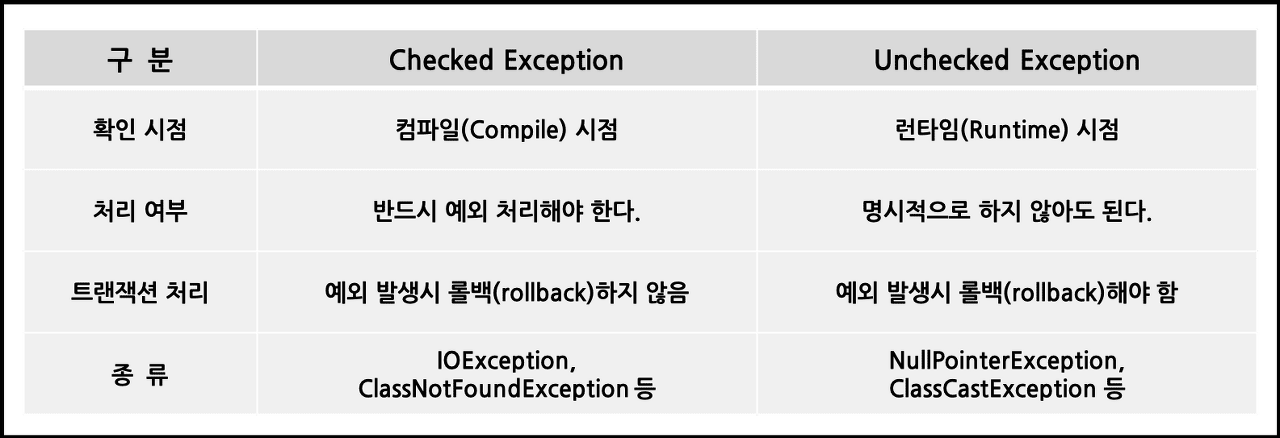 다시 정리하면 자바에서 예외는 RuntimeException을 상속하지 않고 꼭 처리해야 하는 Checked Exception 과 반대로 명시적으로 처리하지 않아도 되는 Unchecked Exception 으로 구분할 수 있다.