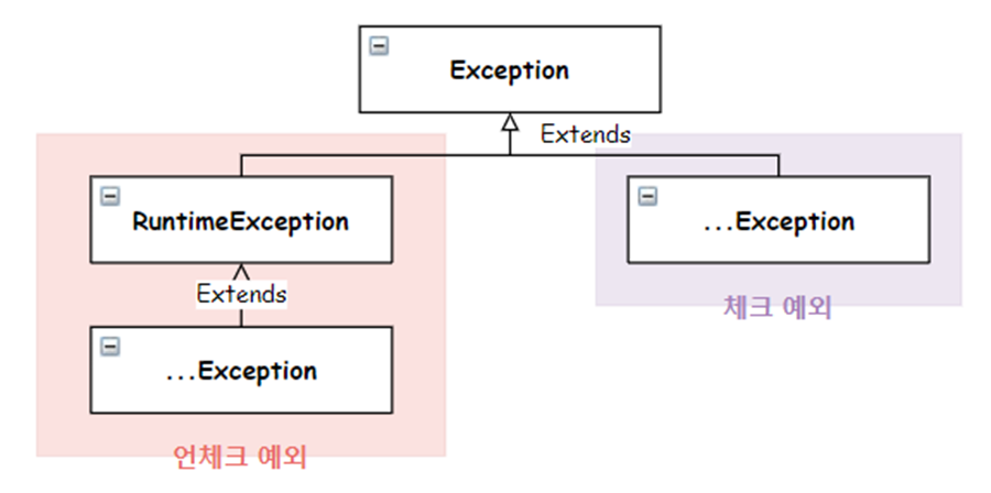 (예외에는 크게 Error(java.lang.Error), Exception(java.lang.Exception)과 체크예외, RuntimeException과 언체크/런타임 예외 가 있다.)