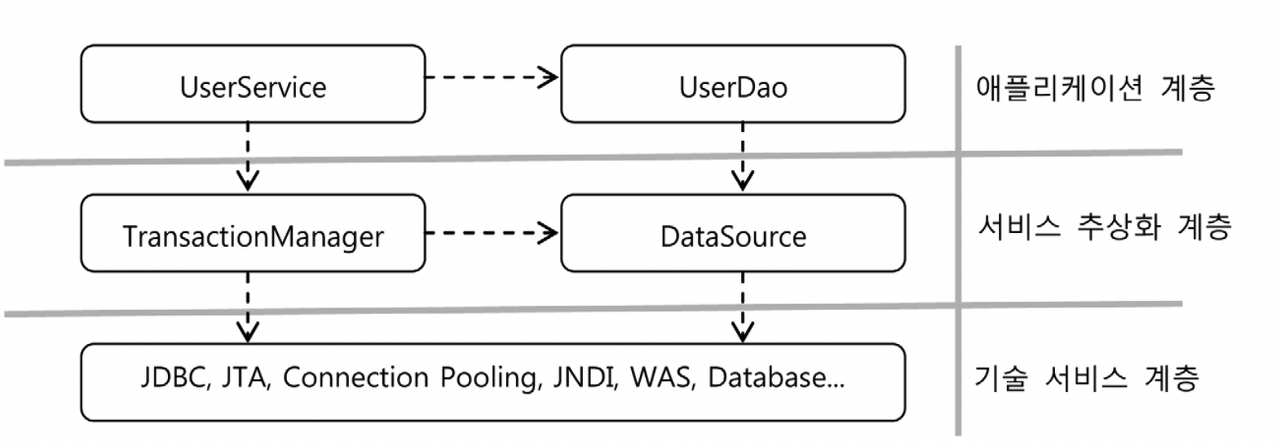 - 트랜잭션 경계설정 코드가 비즈니스 로직 코드에 영향을 주지 않게 하려면 스프링이 제공하는 트랜잭션 서비스 추상화를 이용하면 된다.
