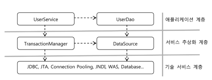 이를 위한 핵심적인 도구가 바로 스프링이 제공하는 DI다. DI를 통해 객체 생성과 의존관계 설정을 스프링에 맡기면 완벽하게 특정 기술에서 자유로운 애플리케이션 계층의 코드를 가질 수 있게 된다.