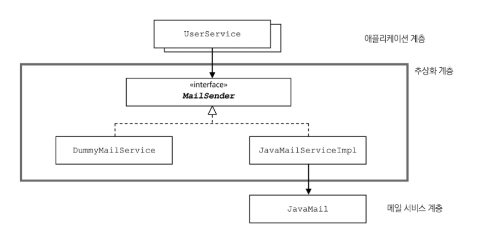 서비스 추상화란 이렇게 원활한 테스트만을 위해서도 충분히 가치가 있다. 기술이나 환경이 바뀔 가능성이 있음에도, JavaMail처럼 확장이 불가능하게 설계해놓은 API를 사용해야하는 경우라면 추상화 계층의 도입을 고려해볼 필요가 있다. 특별히 외부의 리소스와 연동하는 대부분 작업은 추상화의 대상이 될 수 있다.