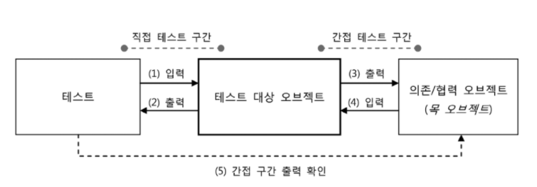 테스트 대상 오브젝트의 메소드가 돌려주는 결과뿐 아니라 테스트 오브젝트가 간접적으로 의존 오브젝트에 넘기는 값과 그 행위 자체에 대해서도 검증하고 싶은 경우에는 테스트 대상의 간접적인 출력 결과를 검증하고, 테스트 대상 오브젝트와 의존 오브젝트 사이에서 일어나는 일을 검증할 수 있도록 특별히 설계된 목 오브젝트(mock object)를 사용해야 한다. 목 오브젝트는 스텁처럼 테스트 오브젝트가 정상적으로 실행되도록 도와주면서, 테스트 오브젝트와 자신의 사이에서 일어나는 커뮤니케이션 내용을 저장해뒀다가 테스트 결과를 검증하는 데 활용할 수 있게 해준다.
