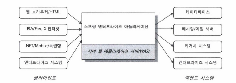 가장 많이 사용되는 구조는 클라이언트가 웹 브라우저이고 백엔드 시스템이 DB인 구성이다. 스프링 엔터프라이즈 애플리케이션이 이용하는 백엔드 시스템으로는 DB, 메시징 서버, 메일 서버, 메인프레임도 가능하다. 한 번에 여러 종류의 백엔드 시스템을 이용할 수도 있다.