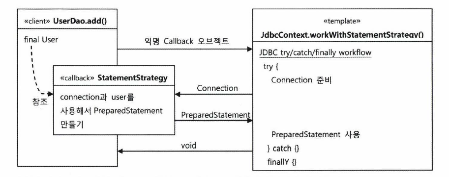 전략패턴의 관점에서 볼 때 UserDao 의 메소드가 클라이언트, 익명 내부 클래스로 만들어진 것이 개별적인 전략, jdbcContextWithStatementStrategy() 메소드가 컨텍스트라 볼 수 있다.