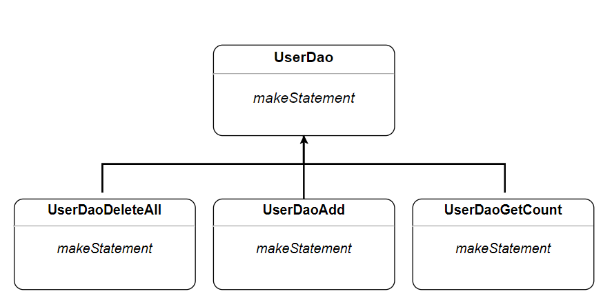 이와 같이 적용하면 Connection과 PrepareStatement의 리소스를 필요로 하는 모든 메소드들은 슈퍼클래스로 정의한 UserDao를 상속받게될 것이다. 그렇다면 다음과 같은 구조가 된다.