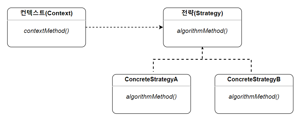 위 그림에서 좌측에 있는 Context의 contextMethod()에서 일정한 구조를 가지고 동작하다가 특정 확장 기능은 Strategy 인터페이스를 통해 외부의 독립된 전략 클래스에 위임하는 것이다.